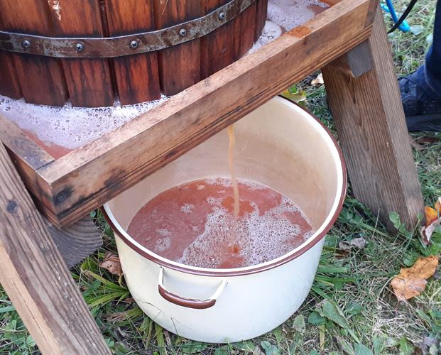 2025 -- It's Time for Fresh Cider! 2022 September 19 -- Cider Time I stepped into the root cellar to add another box of apples and realized the only place to put it was where I was standing. I'd been drying apples and saucing apples and eating apples but that just wasn't enough. It was time to make cider! And the day presented itself, not too hot, not too cold, just enough clouds, just enough sun. Life can be so good. And so is the cider! It had been three years since we'd had a bumper crop of apples enough to press so we were very ready for some fresh brew. Five half bushels, about 100 lbs, of Beacon and Dudley apples, soon (well, after a couple of hours) emerged as 4 1/2 gallons of fresh sweet cider.